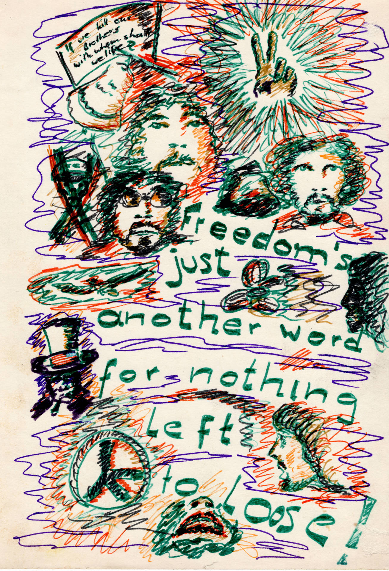 1965 war ich zehn Jahre alt. Wir spielten auf der Dorfstraße Fußball und aus dem Kofferradio kam "Hey, wait a minute Mr. postmann" von den Beatles. Die Größeren hatten schon so ein Radio, und ich durfte mir manchmal das meiner Tante Annelies (danke, meine liebe!) ausborgen. Damals begann mein Beatles-Enthusiasmus. 5 Jahre später kam ich zur Erweiterten Oberschule Markranstädt und die Beatles lösten sich schon wieder auf, was meiner Liebe zu dieser Musik keinen Abbruch tat. Ich war ständig am Zeichnen und Kritzeln. Eine Freundin besaß das "Beatles-Songbook", borgte es mir für ein/zwei Wochen und ich schrieb die Texte in Tag- und Nachtarbeit ab. Seitdem kann ich Englisch, liebe diese Sprache und "yeah,yeah-Musik", wie sie Walter Ulbricht einmal bezeichnete. Zur Illustration meines eigenen Songbooks malte und zeichnete ich meine eigenen Bilder. So entstanden diese Phantasien eines damals 16jährigen. Ein Titel von Janis Joplin ist auch dabei und natürlich was zum Blues.